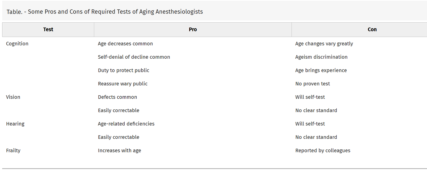 Johnstone R, Bader AM, Hepner DL. Assessing Older Anesthesiologists. Anesth Analg. 2025 May 1;140(5):1105-1110. doi: 10.1213/ANE.0000000000007179. PMID: 39163252.