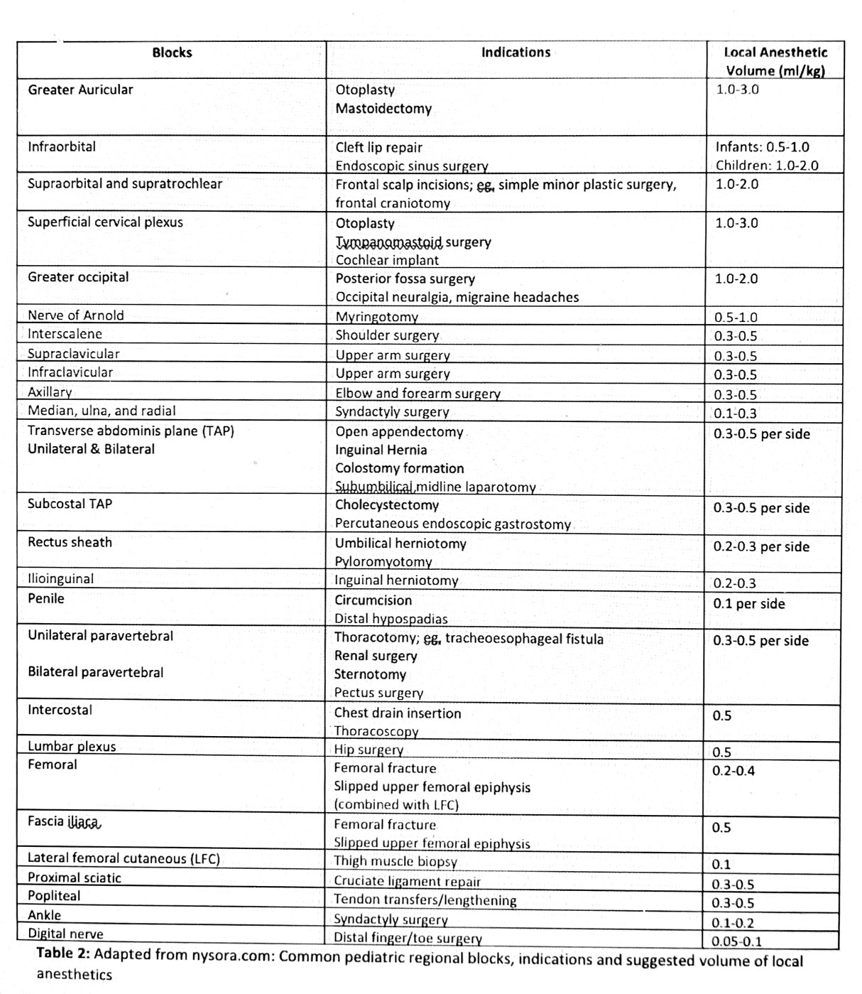 A common question often arises when performing a regional anesthetic technique: “How much and which local anesthetic should I inject”? Here are the Tables (and I’d like to thank the authors for providing them to me) from the article. I’m hoping that many of you may find them handy. I don’t want to quibble. Indeed, these numbers look pretty good to me. Personally, I like to add epinephrine for higher volume blocks as a marker of intravascular injection (peaked T wave on ECG) and use 0.3-0.4 mL as the minimum volume for a baby spinal, regardless of the drug, but that’s me. Further, I’m sure that many of you may disagree with some of these recommendations, perhaps vociferously. If you do, please comment in the PAAD when this is posted. Finally, I know that several institutions make handy dandy quick reference cards for residents, fellows, and faculty. This may be of value in your next editions. Myron Yaster MD