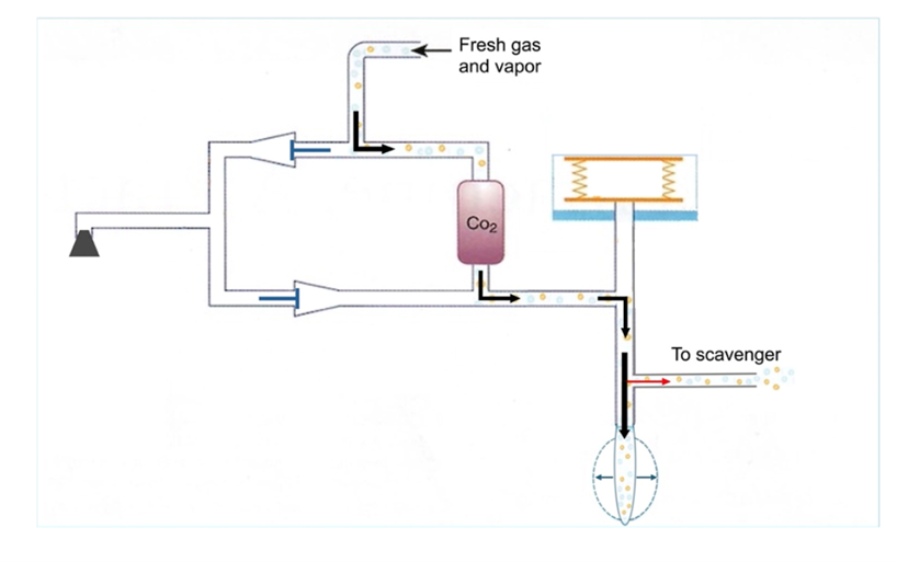 Figure 2A – Example of priming with the circuit occluded. Note that the inspiratory and expiratory limbs are not primed and also the reservoir bag full of non-anesthetic containing gas is bypassed. This approach can help to speed the rate of rise of anesthetic during mask induction but also generates significant waste.