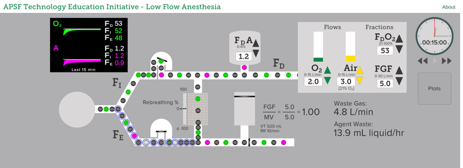 The APSF/ASA course on low flow anesthesia (apsf.org/tei/lfa) uses guided simulation to explore the relationship between fresh gas flow, gas concentrations in the circuit and waste that ends up in the scavenging system. While the figure is a static image of an idealized circle system, the simulation is animated and demonstrates how the concentrations change over time including uptake of anesthetic and oxygen. It is not possible to model the impact of priming with this tool, but the following example compares the change in anesthetic concentrations in the circuit at different fresh gas flows with a plot indicating the time required to reach equilibrium at different fresh gas flows.