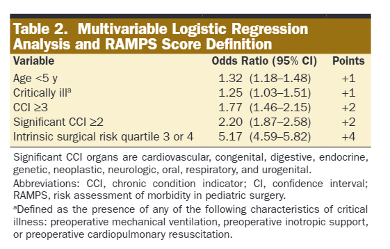 Nasr et al report their institutionally developed and tested Risk Assessment of morbidity in pediatric surgery (RAMPS) score which has the ability to identify a high-risk cohort of pediatric patients using a component tool. This is an astonishing piece of work that should be a must read. Before going into some specifics some important caveats. It does not apply to patients with congenital heart disease AND to the very common surgical population of T&As and strabismus surgery because they aren’t included in NSQUIP. The key variables from Table 2 in the paper: