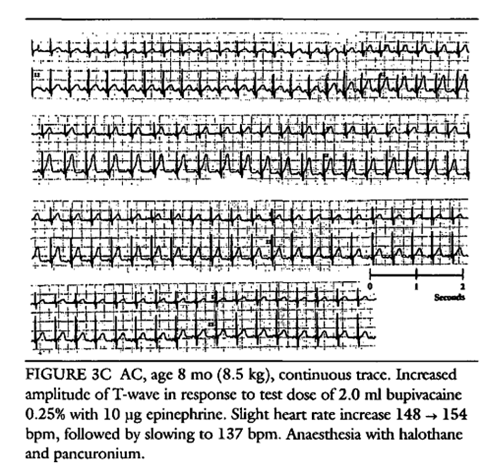 There was no immediate explanation for the T-wave changes, but it occurred to me that this might be useful in monitoring test doses for caudal injections. Previously, most Peds anesthesiologists seemed to monitor only for blood aspiration, or heart rate change (blood pressure changes being too evanescent to capture); pretreatment with atropine was common (but of note, some of my fellowship mentors did not use epinephrine, depending on blood aspiration and the ”feel” of injection).