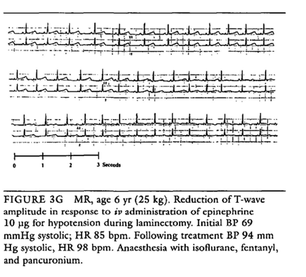 I was managing a patient in whom I seemingly fell behind in tracking fluid deficits, and decided to give a temporizing pressor. Conventional wisdom taught that epi was “Nature’s own” presssor of choice, ephedirne being more unpredictable in children. After the epi dose, blood pressure improved but I noticed - with some angst - tall peaked T-waves on the ECG, which resolved quickly. The case proceeded uneventfully. The next occasion I had to use epi, I noticed the same phenomenon. On checking with the adult electrophysiologists, they directed me to a wealth of literature showing T-wave flattening with epinephrine, which was commonly used as an infusion (not a bolus) to test antiarrhythmics.