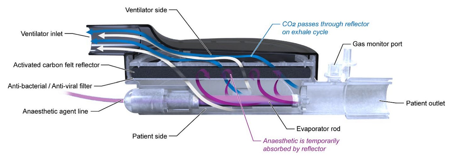 There is a thorough and excellent review of the AnaConDa that should answer most, if not all, questions about the utility of the device for using an ICU ventilator to deliver inhaled anesthetics. (1) In a nutshell, this device is essentially a heat and moisture exchanger (HME) with the capability to also capture and redeliver inhaled anesthetics. HME’s are placed between the y-piece of the ventilator circuit and the endotracheal tube. These devices include a special membrane that absorbs moisture in the exhaled gas and releases the moisture back to the patient during inspiration. They also typically include a filter for capturing infectious material – both viral and bacterial. The AnaConDa adds to the typical HME membrane another layer called an activated carbon felt reflector. Activated carbon is well known to absorb inhalation anesthetic agents and is used in other devices such as the Vapor-Clean (Dynasthetics, Salt Lake City, UT) which prevents inhaled anesthetics from reaching a patient who may be susceptible to MH. The reflector in the AnaConDa has been designed to absorb inhaled anesthetics from exhaled gas and return the drug to the patient during inspiration. The device includes a port for administering liquid anesthetic via a syringe pump and another port for measuring the concentration of anesthetic and other gases.